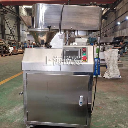 本機有送料機構(gòu)、壓片機構(gòu)、液壓機構(gòu)、機架和電氣控制等部件組成,送料,壓片、制粒均采用變頻無級調(diào)速,油泵壓力可調(diào),成品細(xì)度可以通過更換不同的篩網(wǎng)獲得。改進(jìn)制粒轉(zhuǎn)籠,增加了顆粒的成品率。本機裝拆、清洗方便,與物料接觸部分皆為不銹鋼制作。產(chǎn)品符合GMP要求。物料由頂部送料漏斗加入,經(jīng)兩壓輪強制擠壓成片狀后進(jìn)入下部制粒室,在制粒室中片狀物料被制粒刀片打碎,然后進(jìn)入整粒室,直至顆粒小于或等于網(wǎng)孔徑,顆粒通過網(wǎng)篩到盛料托盤。所需要顆粒大小可以通過調(diào)整篩網(wǎng)大小來決定。